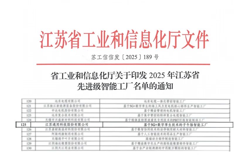 近日,江蘇省工業(yè)和信息化廳正式公布2025年江蘇省先進(jìn)級(jí)智能工廠名單,通用股份榮耀上榜。這一榮譽(yù)不僅是對(duì)通用股份前瞻創(chuàng)新實(shí)踐的高度認(rèn)可